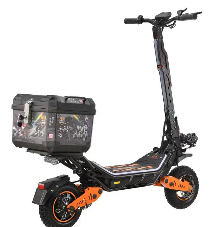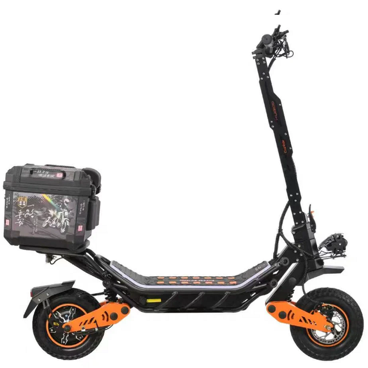 Experience the thrill of the Kugoo City Ride High Speed Electric Scooter built for riders who demand speed, power, and endurance. With a 1200W brushless motor, this heavy-duty scooter reaches an impressive 85 km/h top speed, making every ride an adrenaline rush. The 48V 18.2Ah battery ensures a 55 km medium-speed range , so you can go further without worrying about recharging too soon. Designed for urban explorers it features 12-inch wheels and disc brakes for superior stability and safety. Its sturdy frame supports up to 150 kg, and the included rear storage box adds practicality for daily commuting. Whether folded or unfolded, the compact design makes storage and transport a breeze, while the bold orange and black color options make you stand out in style.